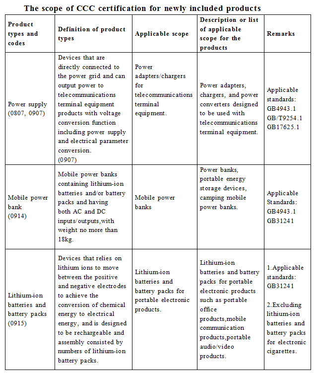 In accordance with the requirements of "the Opinions from the Genral Office of the State Council on Deepening the Reform of the Management System of the Electronics and Electrical Industry" (State Council Document No. [2022] 31), the State Administration for Market Regulation(SAMR) has decided to implement compulsory product certification (CCC certification) to lithium-ion batteries and battery packs used in electronic and electrical products, mobile power bank, and power adapters/chargers for telecommunications terminal products (hereinafter collectively referred to as newly included products). The relevant requirements are as follows: